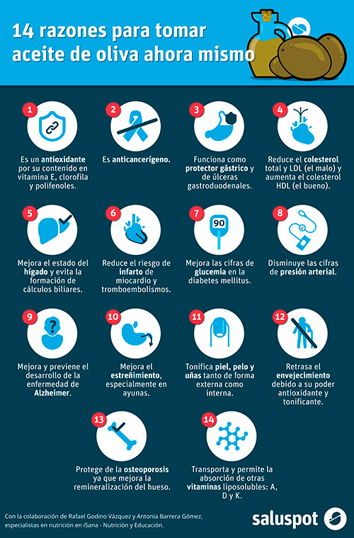 Además, el aceite de oliva disminuye las cifras de presión arterial; mejora y previene el desarrollo de la enfermedad de Alzheimer; mejora el estreñimiento, especialmente en ayunas; tonifica piel, pelo y uñas tanto de forma externa como interna; retrasa el envejecimiento debido a su poder antioxidante y tonificante; protege de la osteoporosis, ya que mejora la remineralización del hueso; y transporta y permite la absorción de otras vitaminas liposolubles: A, D y K.