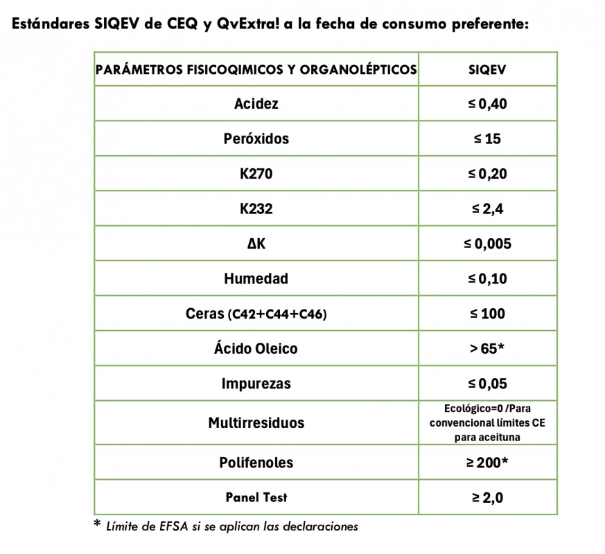 Para ello, creó el Seal International Quality Extra Virgin (SIQEV), un sello resultado del acuerdo entre productores, expertos y consumidores que certifica que el producto que lo lleva cumple con estrictos requisitos de calidad, superiores a los establecidos en la normativa comunitaria actual. Con dicho estándar, se garantiza al consumidor que esa botella contiene un virgen extra excelente, a través de un sistema de auditoría externa realizada en los lineales por la empresa certificadora internacional SGS a la fecha de consumo preferente.