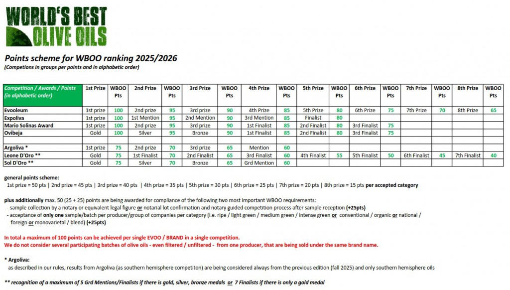 Creado en 2012 por el experto catador alemán Heiko Schmidt a partir de los resultados de las principales competiciones internacionales de aceite de oliva virgen extra en ambos hemisferios, y tomando como referencia el Premio Mario Solinas del Consejo Oleícola Internacional, el ranking “World’s Best Olive Oils” (WBOO) -que reconoce a los vírgenes extra, almazaras y almazaras ecológicas más premiados del mundo- modificó íntegramente la forma de puntuación de los concursos individuales hace ya ocho ediciones, endureciendo los criterios para garantizar el máximo rigor y autenticidad.