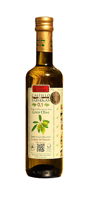 Green Olive procede en su totalidad de la plantación propia que posee Castillo de Tabernas, que cuenta con 470 hectáreas y 100.000 olivos dedicados a la extracción de aceite de oliva virgen extra de la máxima calidad, con las características climáticas especiales del Desierto de Tabernas en Almería, y que posee sólo 0,1º de acidez natural.