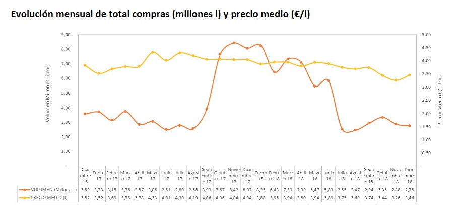Este aceite cerró 2018 con 3,79 euros/litros de media, 0,20 euros menos por litro en comparación con el mismo periodo del año anterior.