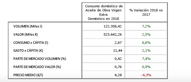En valor el incremento del AOVE fue del 2,5% y la causa fue el efecto de la contracción del precio en un 4,3%. Según el estudio del Ministerio, se trata del aceite que tiene el precio más alto de la categoría, situándose en 4,28 euros/litro de media en 2018, siendo un 48,1% superior a la media de la categoría.