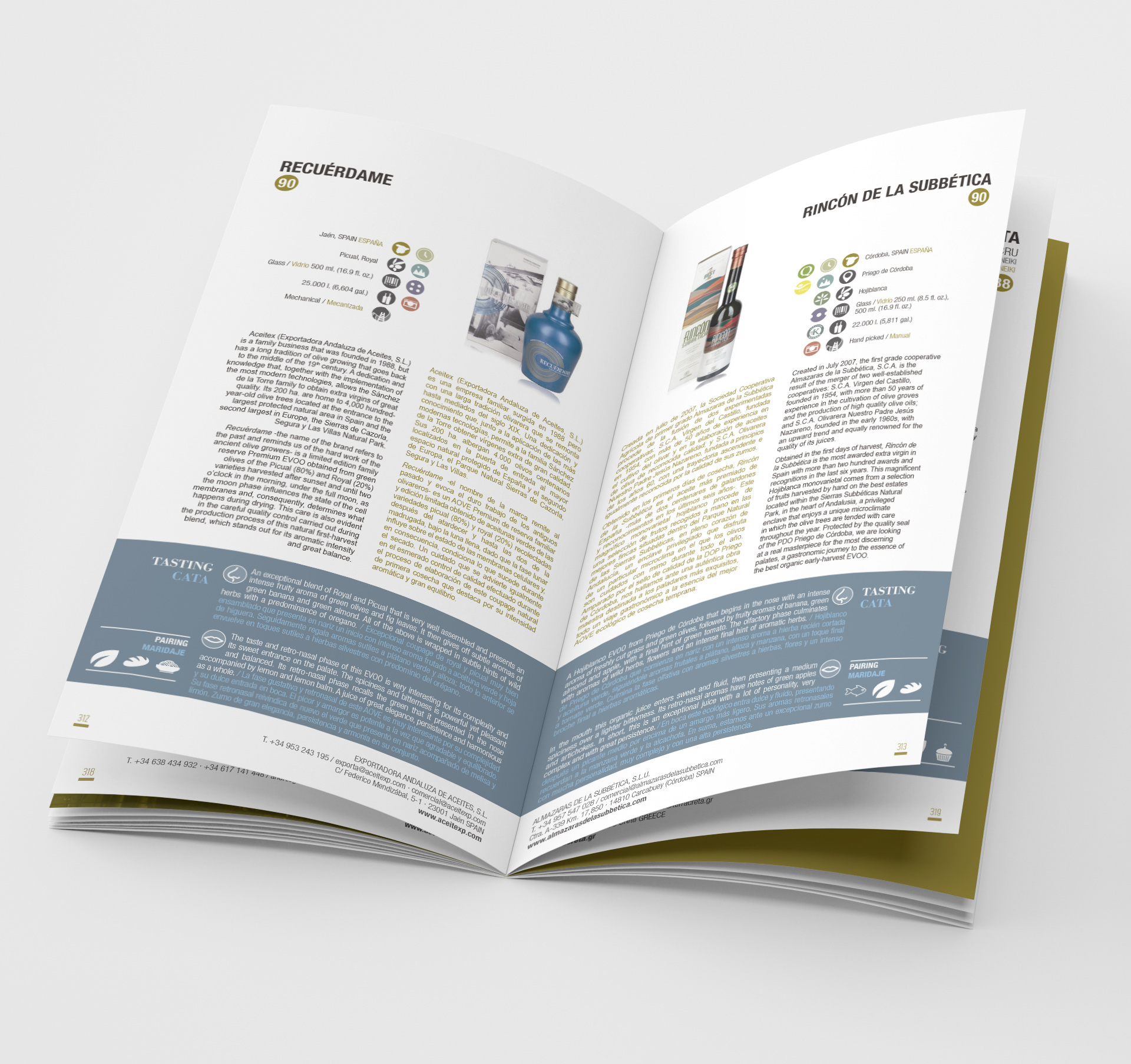 La Guía -de periodicidad anual y 10.000 ejemplares de tirada- incluye una completa ficha informativa de cada uno de los 100 vírgenes extra (características organolépticas, variedad/es de procedencia, situación geográfica y tipo de olivar, volumen comercializable, certificados Kosher, Halal y CAAE, cata organoléptica, maridaje...), acompañada de una imagen de su envase.