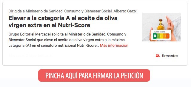 Cabe recordar que Grupo Editorial Mercacei ha sido el único medio que ha puesto en marcha el pasado mes de marzo la primera iniciativa en el sector -a través de la plataforma de firmas Change. org- para que el Ministerio de Consumo eleve el aceite de oliva virgen extra a la máxima categoría (A) en el semáforo nutricional Nutri-Score. Desde Mercacei solicitamos a todo el sector su apoyo a través de la firma y difusión de esta petición en redes sociales para que podamos llegar al máximo número de personas y logremos revertir esta situación que pone en tela de juicio, una vez más, al producto estrella de la Dieta Mediterránea.