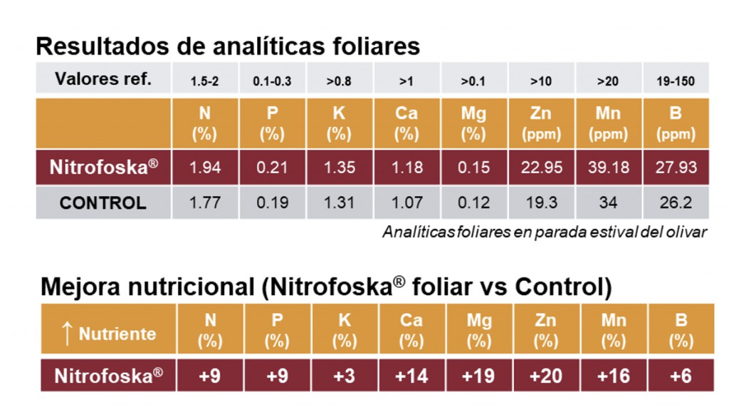 Estos ensayos muestran como Nitrofoska® foliar incrementa la concentración de nutrientes en hoja y favorece su disponibilidad para el árbol. El uso complementario de Nitrofoska® foliar 24-8-20 y Nitrofoska® foliar 10-5-33 junto a la aplicación al suelo de los Nitrofoska® Especiales permite cubrir de forma equilibrada las necesidades nutricionales del olivo a lo largo de su ciclo productivo. Su aplicación estratégica garantiza un desarrollo equilibrado del olivo, una producción de aceite de calidad y una mejor recuperación del árbol tras la cosecha.