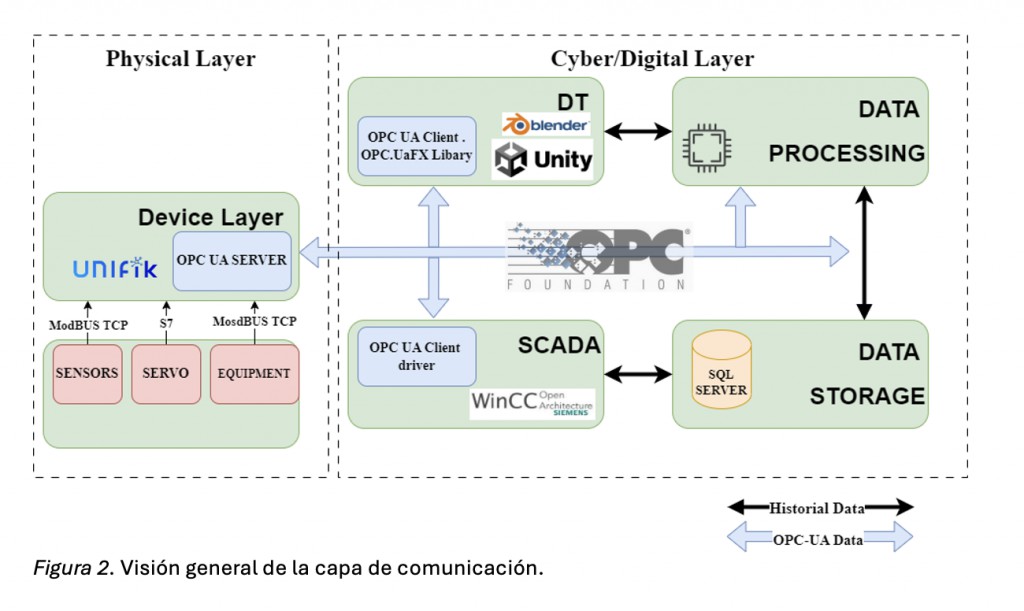 - Capa de comunicación: los datos recopilados por los sensores se transmiten mediante protocolos de comunicación industrial, como OPC-UA, asegurando una conexión segura y eficiente con los servidores de procesamiento.