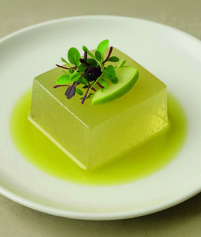 Diseñé un “consomé gelificado de AOVE y manzana verde” que, tras un golpe de calor, se convierte en un caldo sedoso acompañado de jengibre, resaltando la dimensión aromática del aceite.