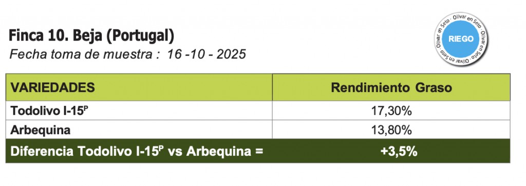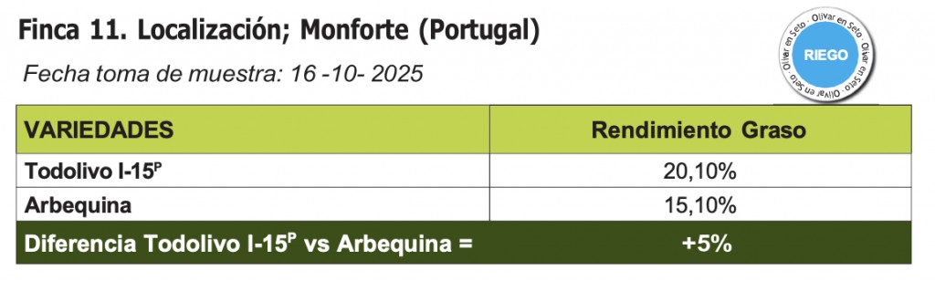 Este comportamiento no se limita al territorio nacional. En Portugal, Todolivo I-15P ha mostrado un incremento del rendimiento graso del 25,4% respecto a la arbequina a finales de septiembre, confirmando su consistencia productiva y su adaptación a distintos entornos de cultivo.