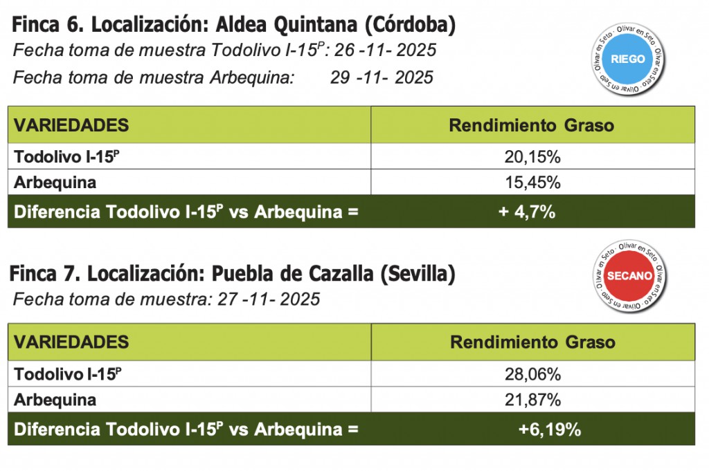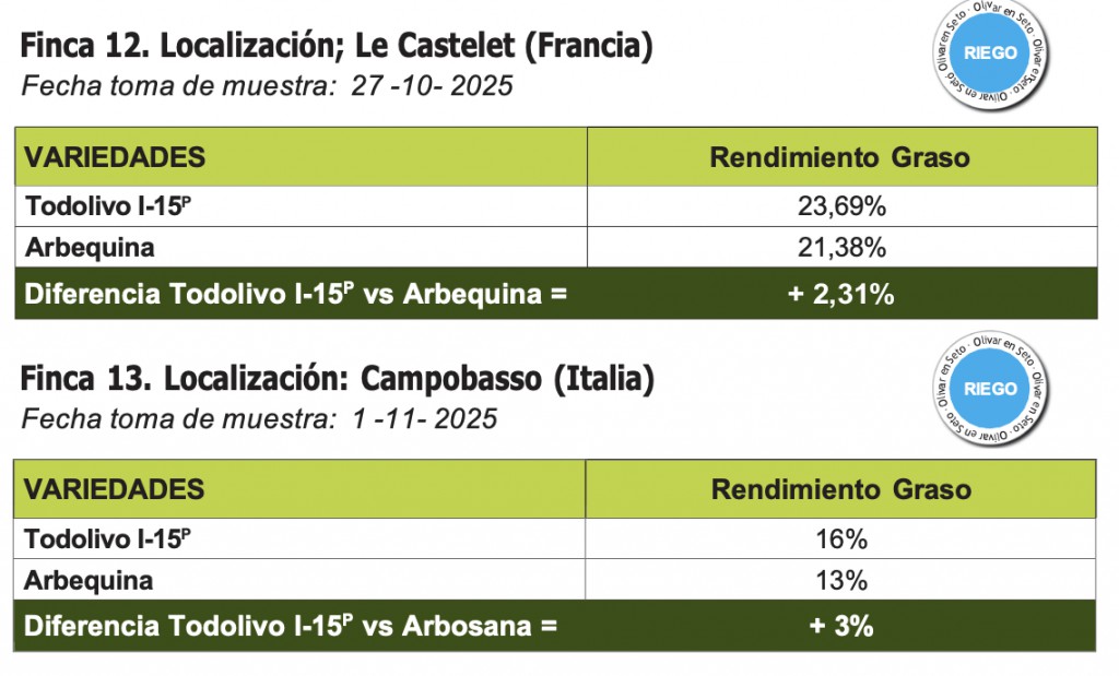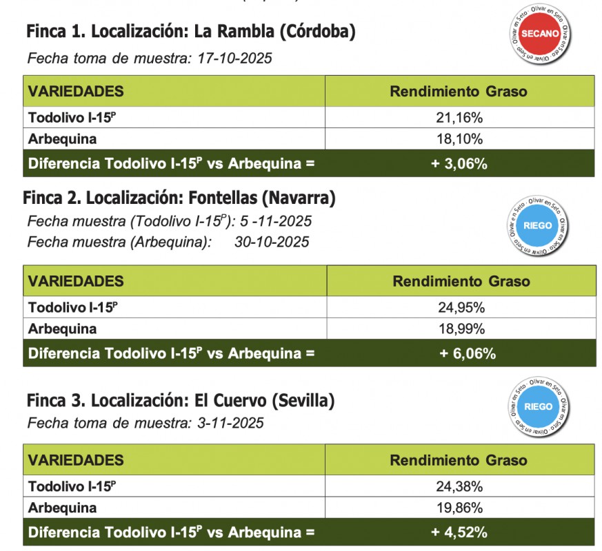 A continuación, a modo comparativo, se detallan las diferencias en rendimiento graso obtenidas por clientes entre Todolivo I-15P y arbequina, en plantaciones de olivar en seto, tanto de riego como en secano y en distintas localizaciones.