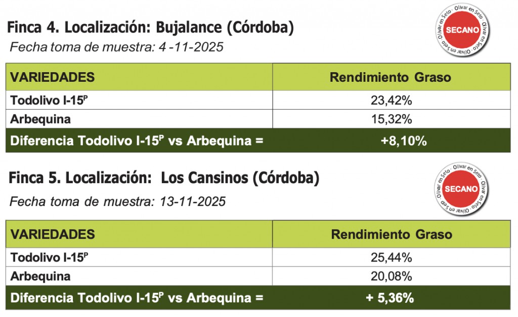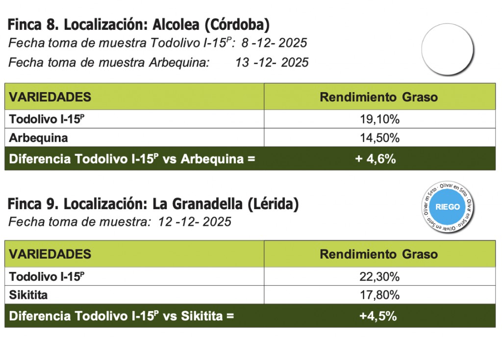 Los resultados de analíticas de aceitunas realizadas en explotaciones comerciales de distintas zonas productoras, confirman el excelente comportamiento productivo y graso de Todolivo I-15P, tanto en recolecciones tempranas como en plena campaña. Estos resultados adquieren un valor estratégico en las primeras fechas de recolección, cuando muchas variedades aún no han completado su acumulación de aceite.