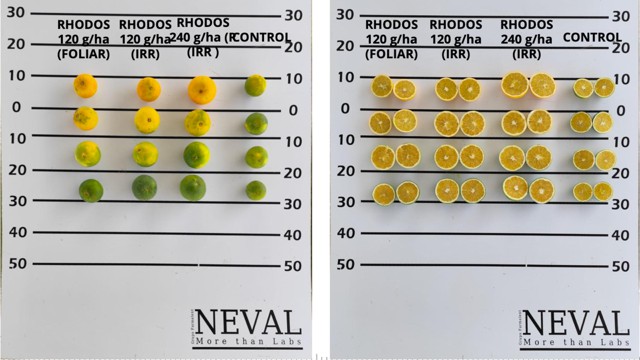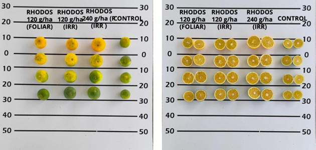 Rhodos es un bioestimulante desarrollado para acompañar al cultivo en momentos clave, de ahí que dichas aplicaciones tuvieran lugar en la floración, cuajado y maduración del fruto, favoreciendo su equilibrio fisiológico y ayudando a expresar su potencial productivo. A través de este ensayo se busca profundizar en su efecto sobre parámetros fundamentales en cítricos, especialmente en un contexto de agricultura cada vez más exigente y orientada a la eficiencia.