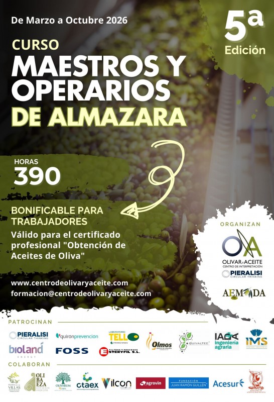 El Centro de Interpretación "Olivar y Aceite" de Úbeda (Jaén) ha acogido la presentación de la 5ª edición del Curso de Maestros y Operarios de Almazara, impulsado junto a la Asociación Nacional de Maestros y Operarios de Almazara (AEMODA). La formación, que consta de 390 horas de duración, comenzará el 10 marzo y se prolongará hasta finales de octubre. Se trata de una modalidad mixta, para facilitar la asistencia del alumnado, combinando sesiones on line con prácticas presenciales. El plazo de inscripción estará abierto hasta el 5 de marzo y las plazas son limitadas.